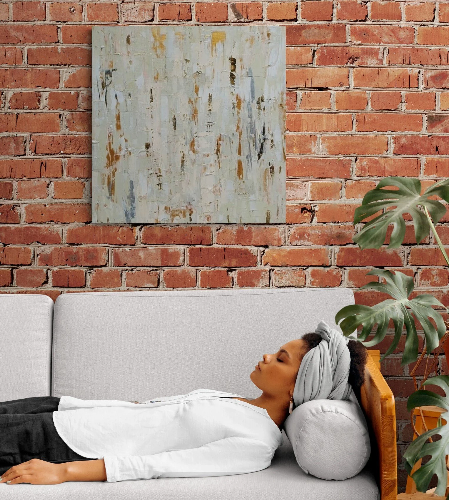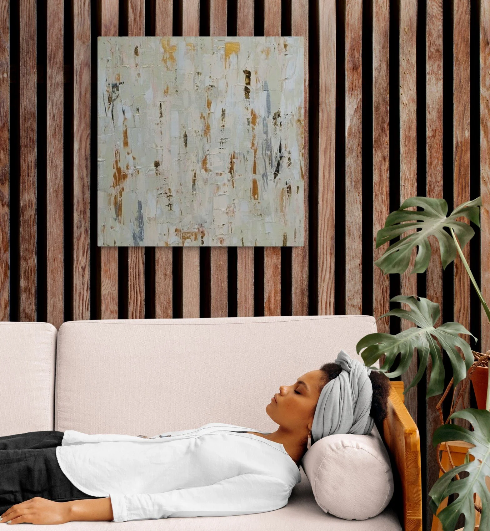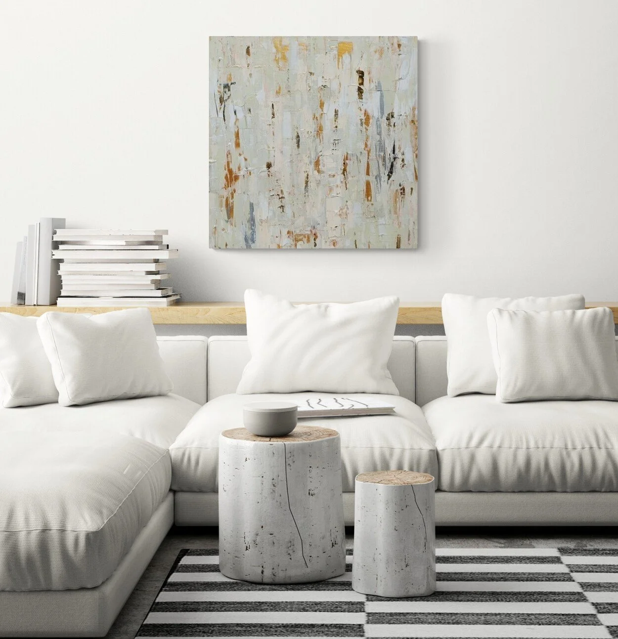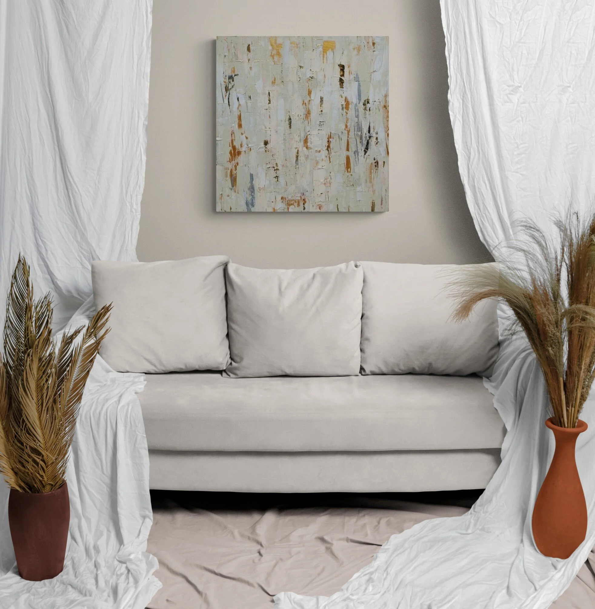 Sandy is an abstract canvas with natural tones, inspired by the long beaches of the Portuguese coast. Its soft and light palette evokes a clean Scandinavian style, perfect for contemporary interiors.