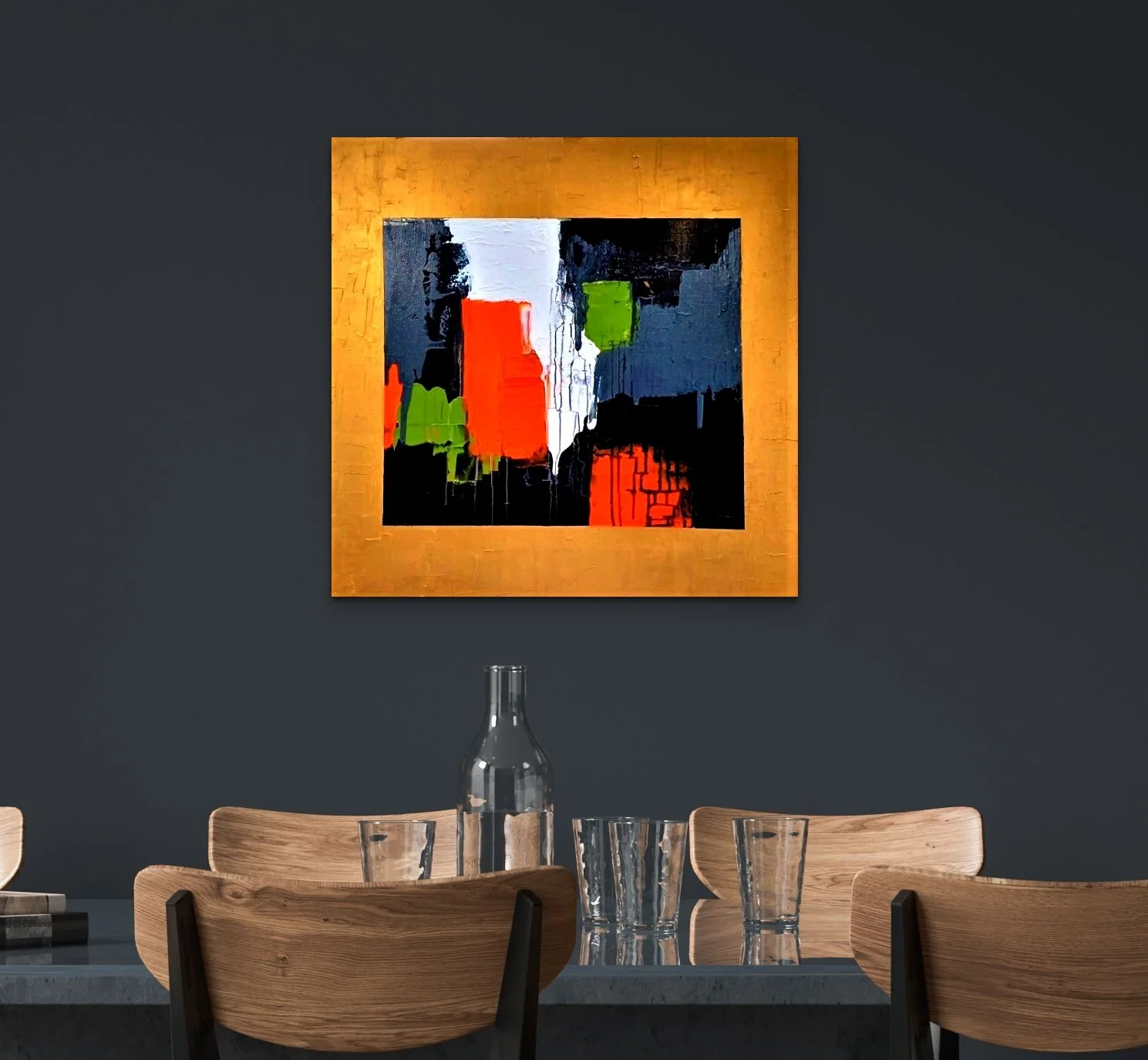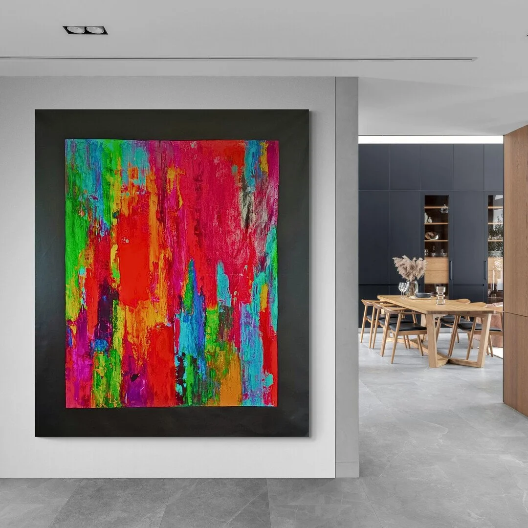 Barthélémy is a canvas where colour flows freely. Intense reds, warm oranges, bright greens, soothing blues and sunny yellows meet without restraint. Painted with a palette knife, each layer is a statement — a step beyond fear, into the joy of creating without limits. This abstract composition opens the space and lets positive energy circulate.