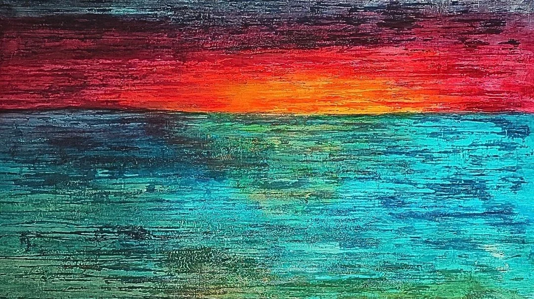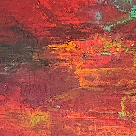 MIRAGES delves into the elusive boundary between reality and illusion. Layers of acrylic, applied with a palette knife, create a rich relief where blazing reds, oranges, and yellows meet subtle hints of turquoise, soft green, and diffused blues. Each stroke captures shifting light, recalling the uncertain shapes that appear on the horizon under a scorching sun. This painting invites quiet contemplation, encouraging viewers to look beyond the obvious, into the delicate space where the eye and imagination meet.