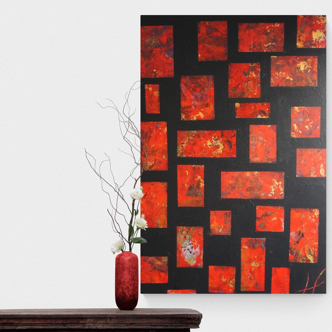 Kyoto draws inspiration from Japanese red and black lacquers, enriched with shimmering gold. This dialogue between depth and brightness creates a balanced composition, where the strength of black meets the warmth of red and the precious glow of gold. In this painting, I sought to capture the timeless elegance of Asian art while infusing it with my own modernity. The red rectangular shapes, accented with gold, stand out against an intense black background, like windows opening onto a refined world.
