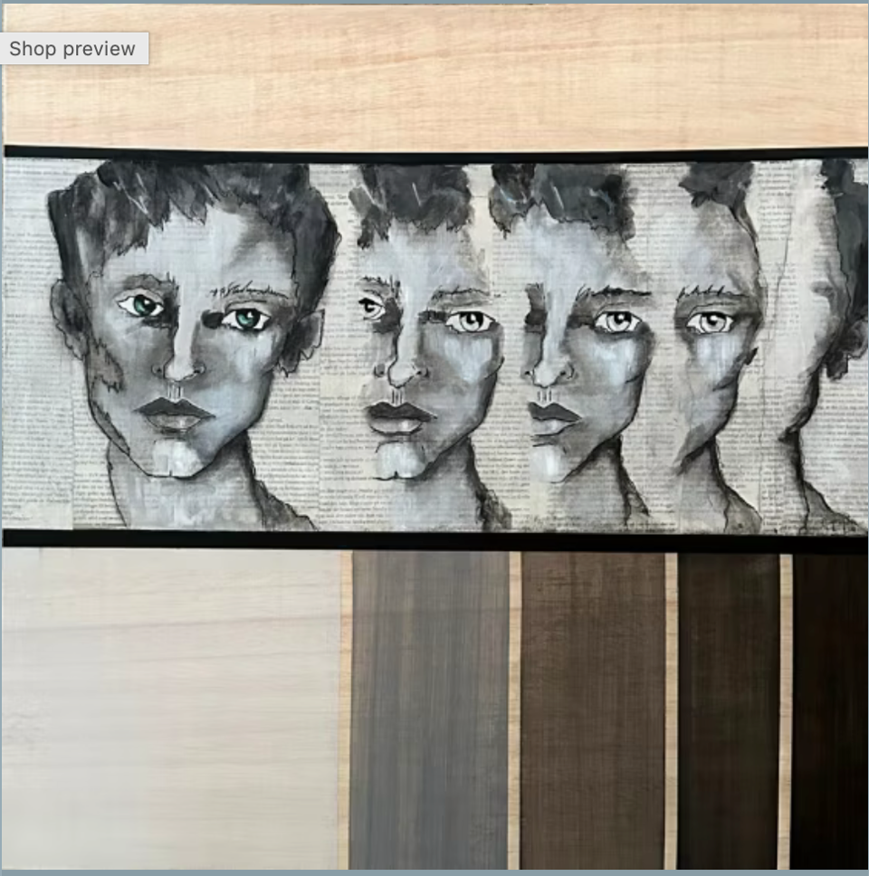 Medium: Collage, acrylic paint and ink on canvas floated in reclaimed wood frame